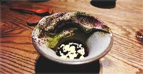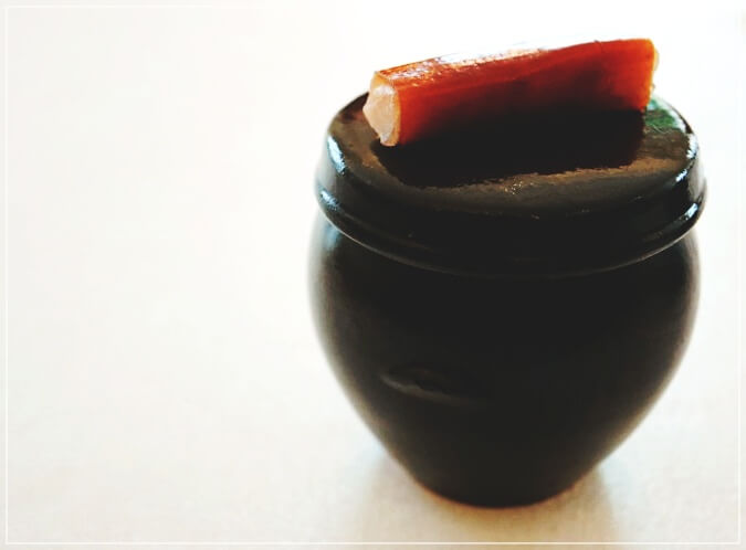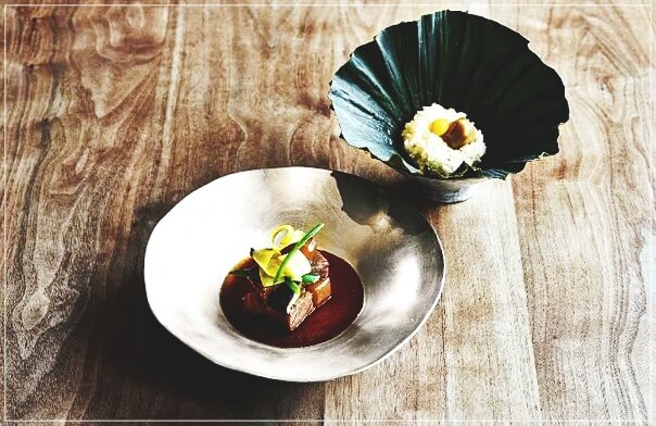 첫 코스는 정말 독특했어요. 메주 위에 작은 도넛 같은 모양이 올려져 나왔는데, 처음엔 ‘이게 무슨 요리지?’ 하는 의문부터 들었답니다. 한 입 베어 무니 쫄깃하면서도 달콤한 크림이 입안 가득 퍼졌어요.